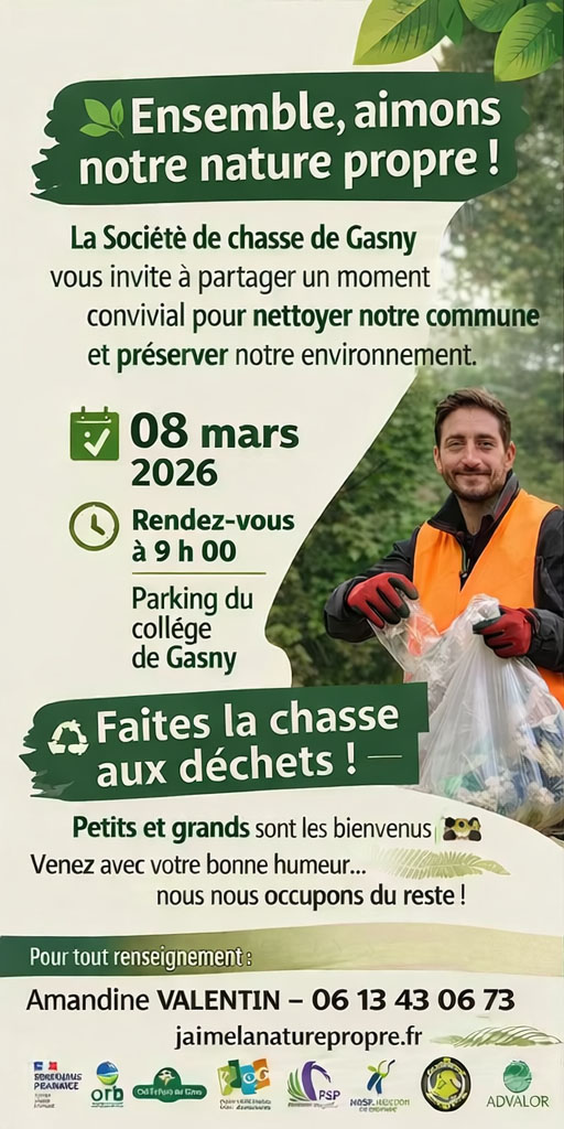 La société de chasse de Gasny vous invite à partager un moment convivial pour nettoyer notre commune et préserver notre environnement